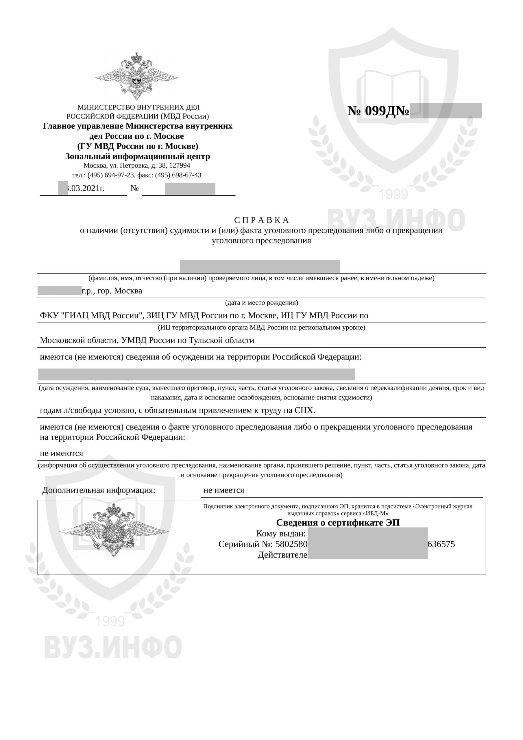 Справка о несудимости из ЗИЦ МВД России ГУ МВД России по г. Москве
